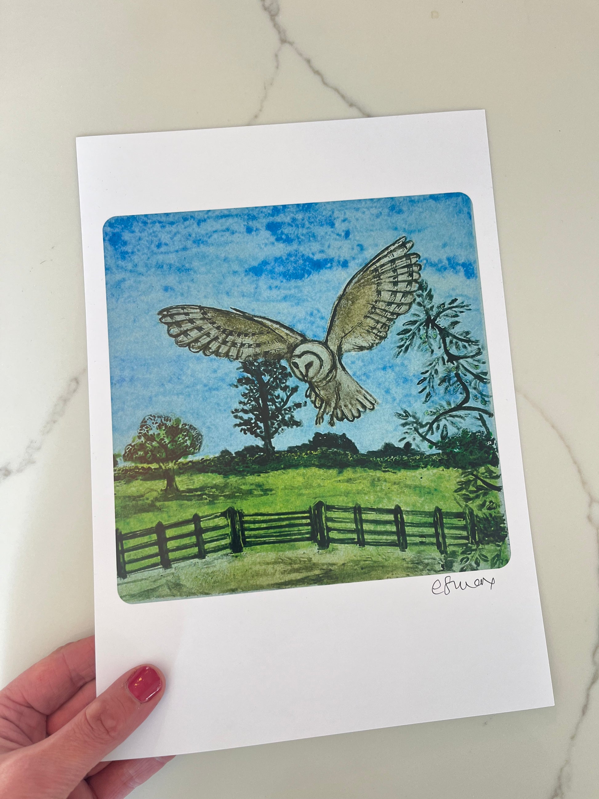 In Full Flight signed art print by Claire Stuarts. Across the way I see a beautiful White Barn Owl, although I’m unsure of where their home is. This image has come from an original piece of glass art I made which was created using glass frits, paints and stains and has now transformed in to signed art prints and cosy cushions. They are available in two size A4 and A3.
